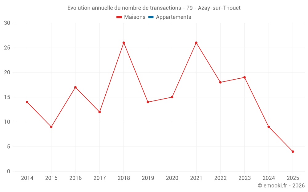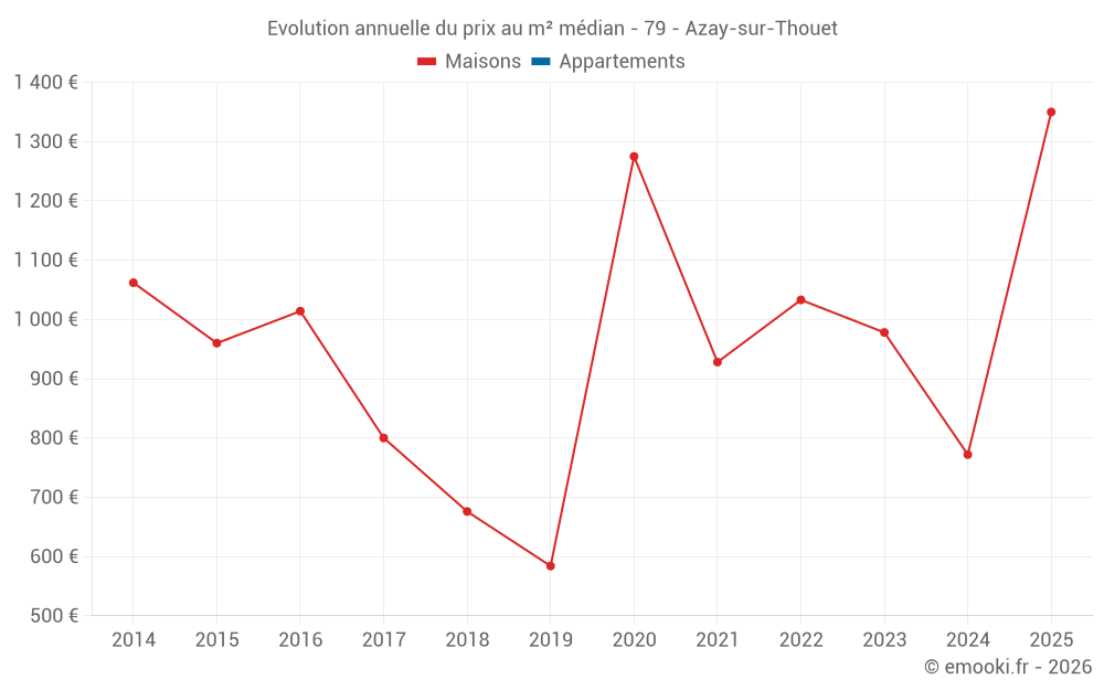 Le prix médian sur les 24 transactions de maisons des 24 derniers mois dans la commune d'Azay-sur-Thouet était de 1 005 € par mètre carré pour une valeur foncière médiane de 104 182 €. Sur cette période 60% des transactions se sont situées entre 601 et 1 645 € par mètre carré (du 2ème au 8ème déciles).