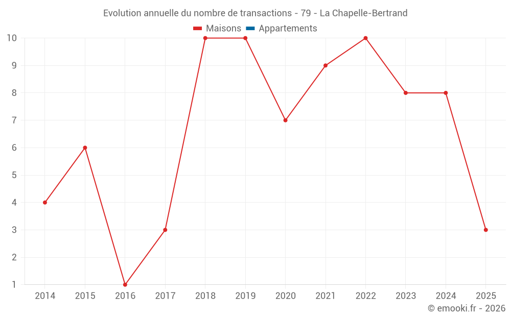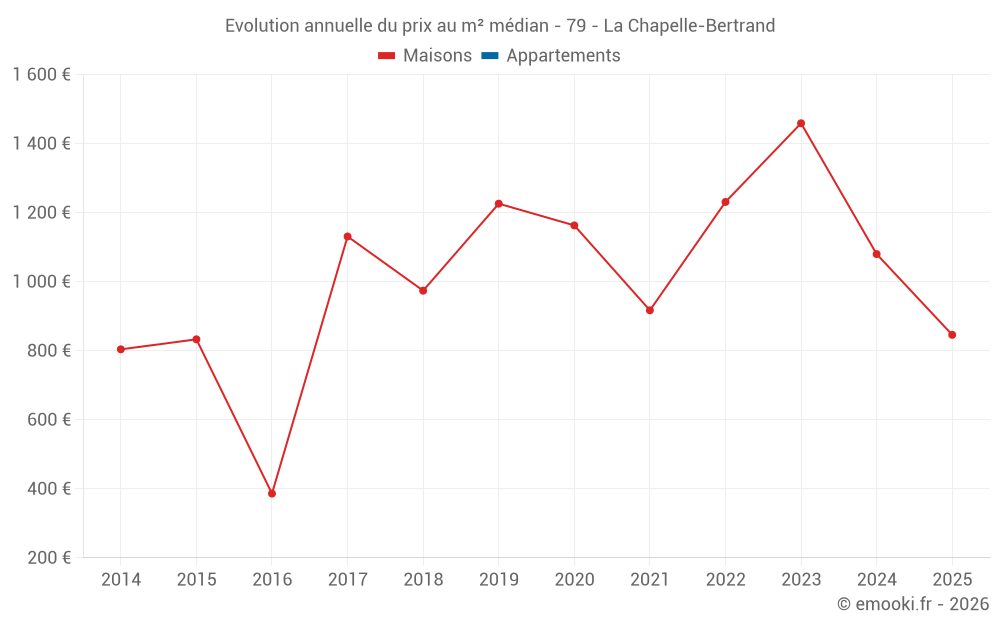 Le prix médian sur les 15 transactions de maisons des 24 derniers mois dans la commune de la Chapelle-Bertrand était de 1 093 € par mètre carré pour une valeur foncière médiane de 152 000 €. Sur cette période 60% des transactions se sont situées entre 778 et 1 489 € par mètre carré (du 2ème au 8ème déciles).