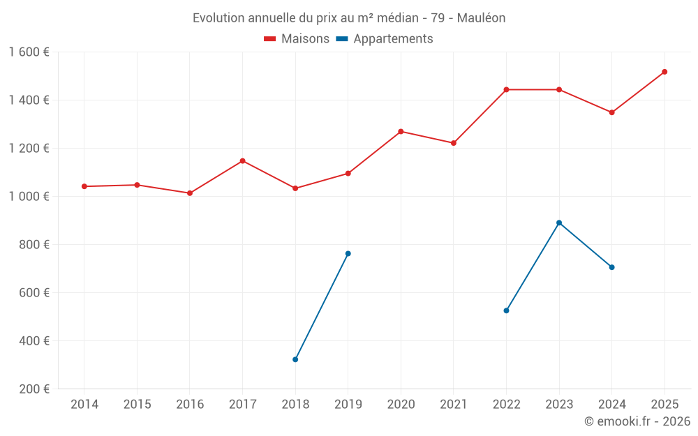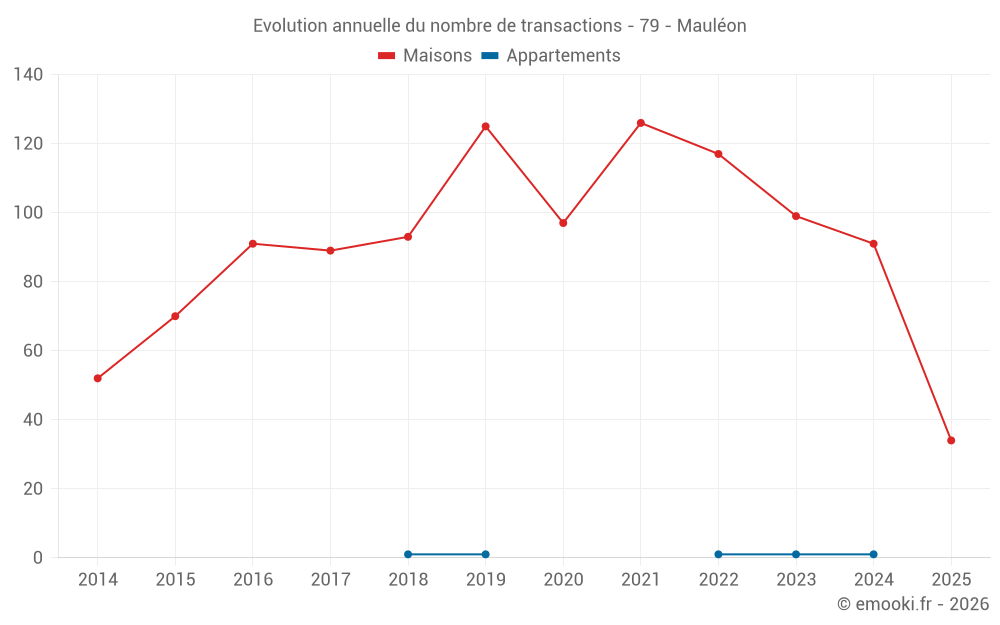 Le prix médian sur les 34 transactions de maisons des 6 derniers mois dans la commune de Mauléon était de 1 518 € par mètre carré pour une valeur foncière médiane de 137 000 €. Sur cette période 60% des transactions se sont situées entre 728 et 1 992 € par mètre carré (du 2ème au 8ème déciles).