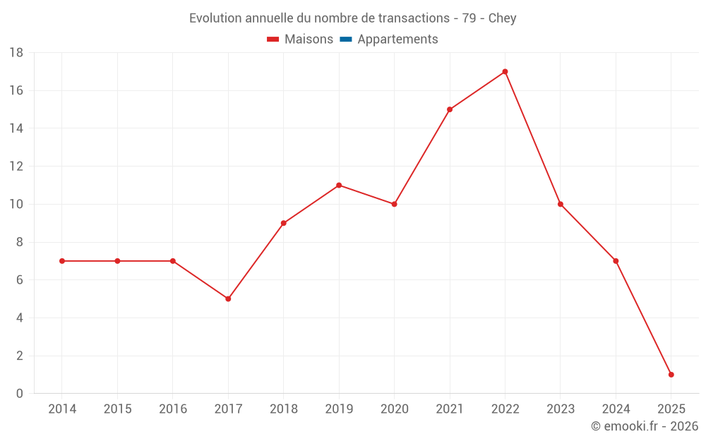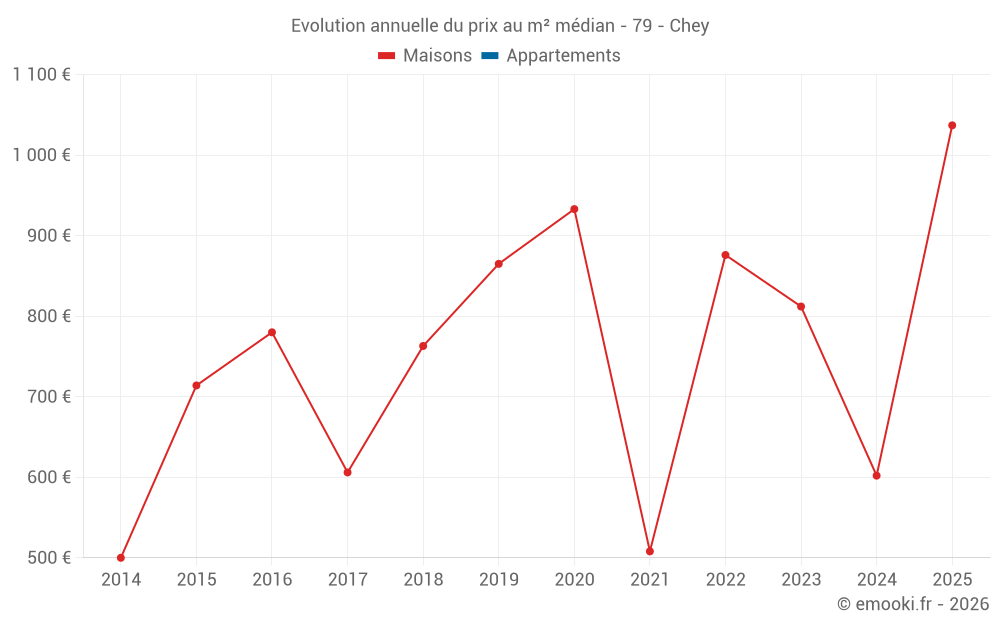 Le prix médian sur les 14 transactions de maisons des 24 derniers mois dans la commune de Chey était de 854 € par mètre carré pour une valeur foncière médiane de 84 818 €. Sur cette période 60% des transactions se sont situées entre 418 et 1 122 € par mètre carré (du 2ème au 8ème déciles).