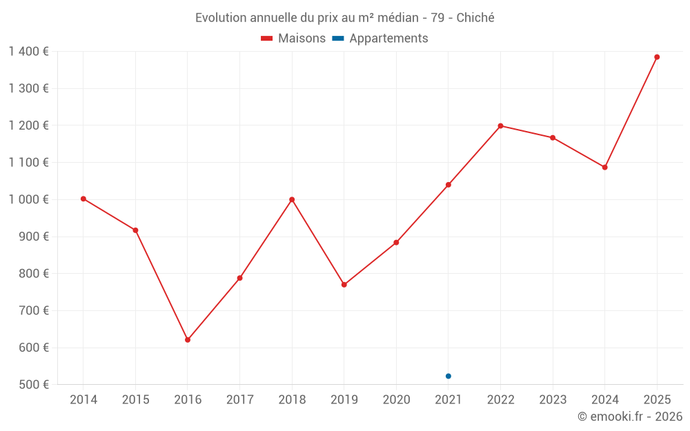 Le prix médian sur les 23 transactions de maisons des 12 derniers mois dans la commune de Chiché était de 1 154 € par mètre carré pour une valeur foncière médiane de 104 300 €. Sur cette période 60% des transactions se sont situées entre 706 et 1 465 € par mètre carré (du 2ème au 8ème déciles).