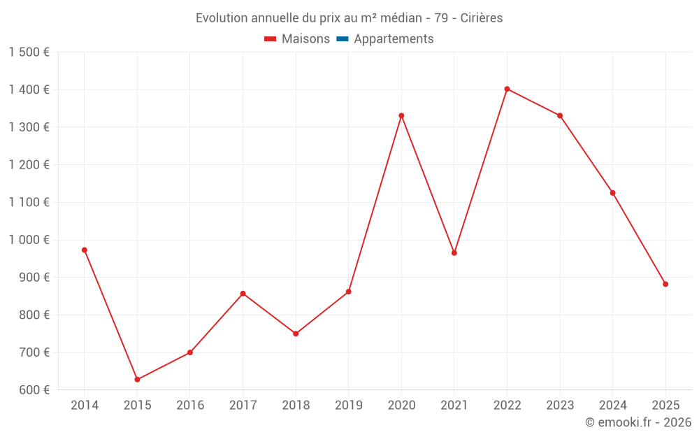 Le prix médian sur les 16 transactions de maisons des 12 derniers mois dans la commune de Cirières était de 1 058 € par mètre carré pour une valeur foncière médiane de 131 500 €. Sur cette période 60% des transactions se sont situées entre 828 et 1 720 € par mètre carré (du 2ème au 8ème déciles).