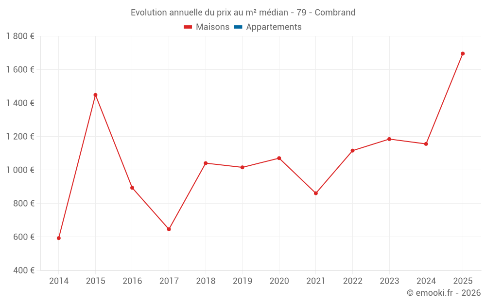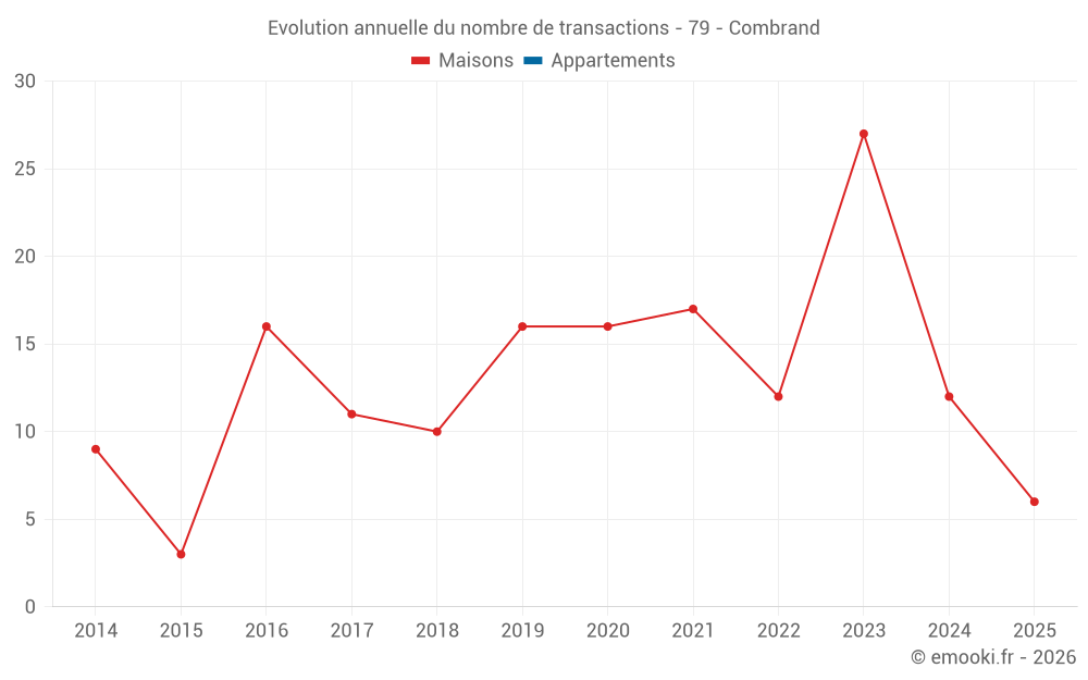 Le prix médian sur les 29 transactions de maisons des 24 derniers mois dans la commune de Combrand était de 1 275 € par mètre carré pour une valeur foncière médiane de 130 000 €. Sur cette période 60% des transactions se sont situées entre 770 et 1 615 € par mètre carré (du 2ème au 8ème déciles).