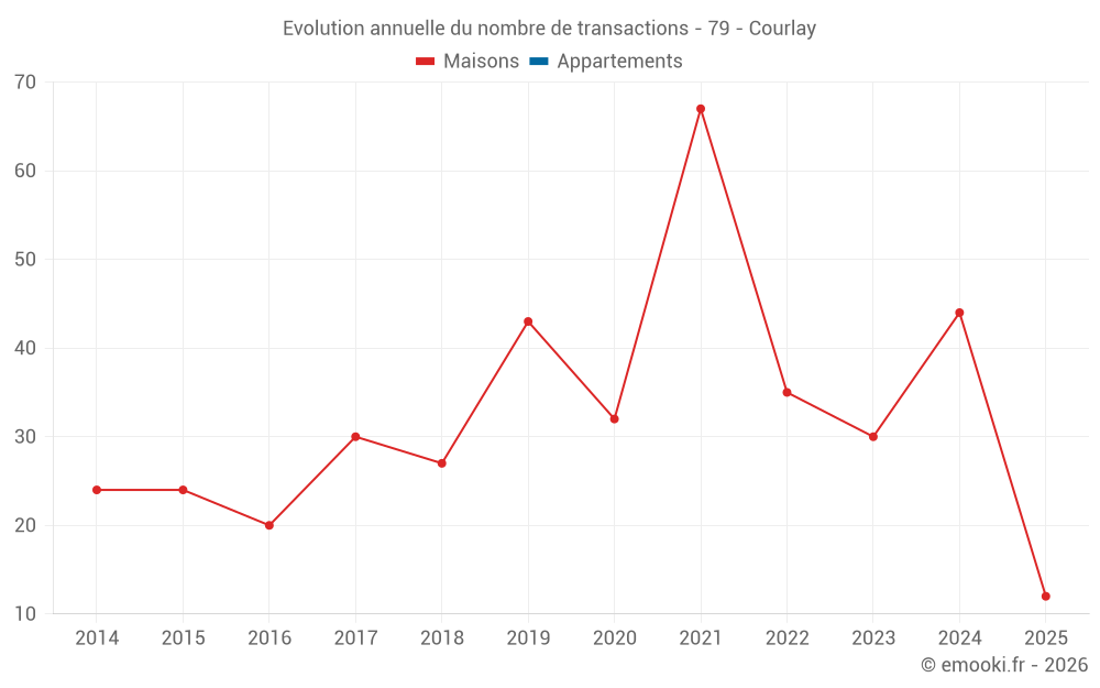 Le prix médian sur les 41 transactions de maisons des 12 derniers mois dans la commune de Courlay était de 1 139 € par mètre carré pour une valeur foncière médiane de 119 560 €. Sur cette période 60% des transactions se sont situées entre 600 et 1 667 € par mètre carré (du 2ème au 8ème déciles).