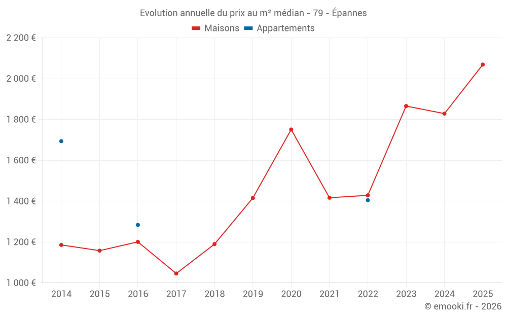 Le prix médian sur les 15 transactions de maisons des 24 derniers mois dans la commune d'Épannes était de 1 852 € par mètre carré pour une valeur foncière médiane de 205 600 €. Sur cette période 60% des transactions se sont situées entre 1 603 et 2 067 € par mètre carré (du 2ème au 8ème déciles).