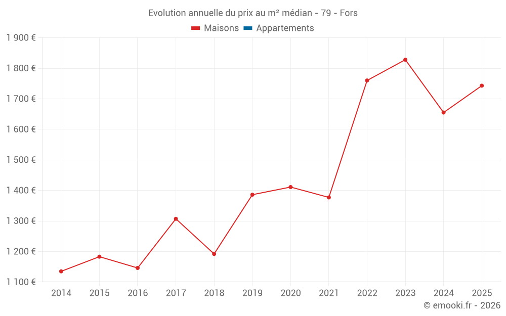 Le prix médian sur les 20 transactions de maisons des 12 derniers mois dans la commune de Fors était de 1 730 € par mètre carré pour une valeur foncière médiane de 183 500 €. Sur cette période 60% des transactions se sont situées entre 1 355 et 2 004 € par mètre carré (du 2ème au 8ème déciles).