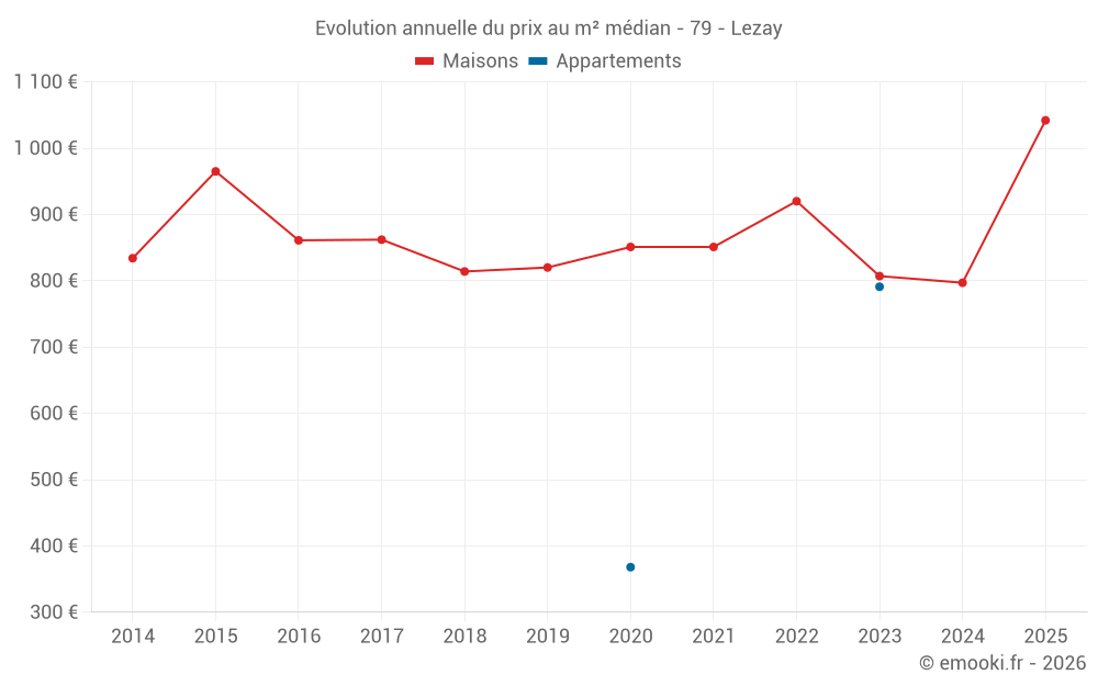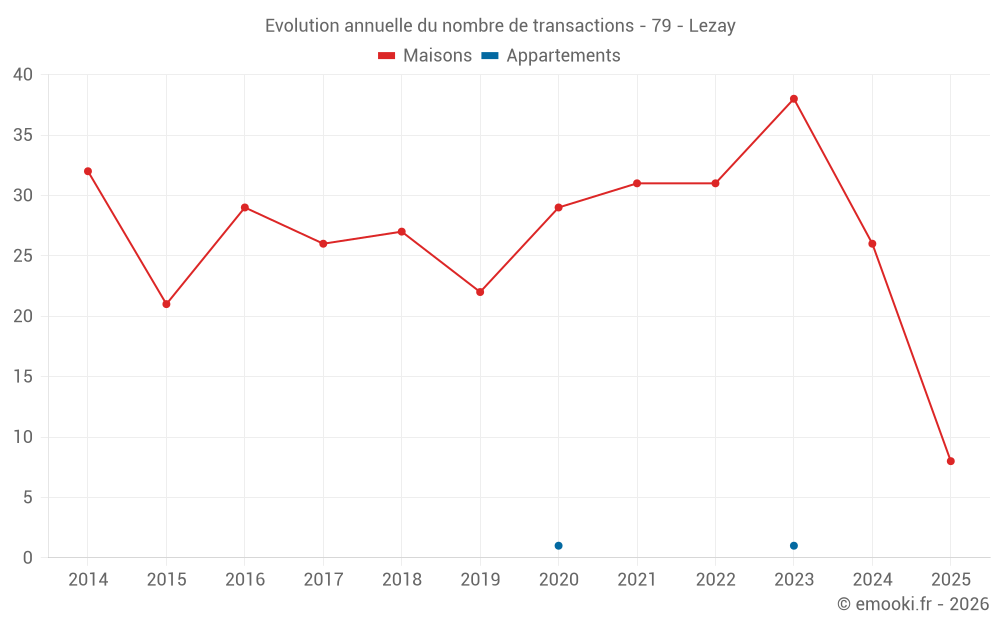 Le prix médian sur les 22 transactions de maisons des 12 derniers mois dans la commune de Lezay était de 990 € par mètre carré pour une valeur foncière médiane de 118 500 €. Sur cette période 60% des transactions se sont situées entre 607 et 1 320 € par mètre carré (du 2ème au 8ème déciles).