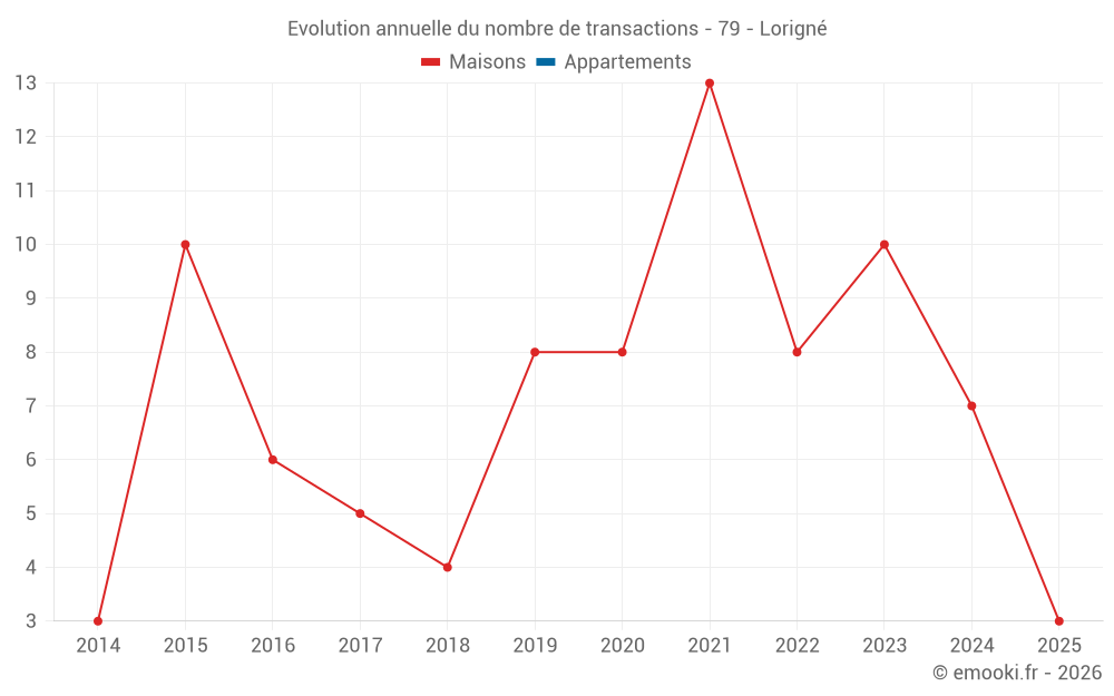 Le prix médian sur les 16 transactions de maisons des 24 derniers mois dans la commune de Lorigné était de 890 € par mètre carré pour une valeur foncière médiane de 107 150 €. Sur cette période 60% des transactions se sont situées entre 630 et 1 295 € par mètre carré (du 2ème au 8ème déciles).