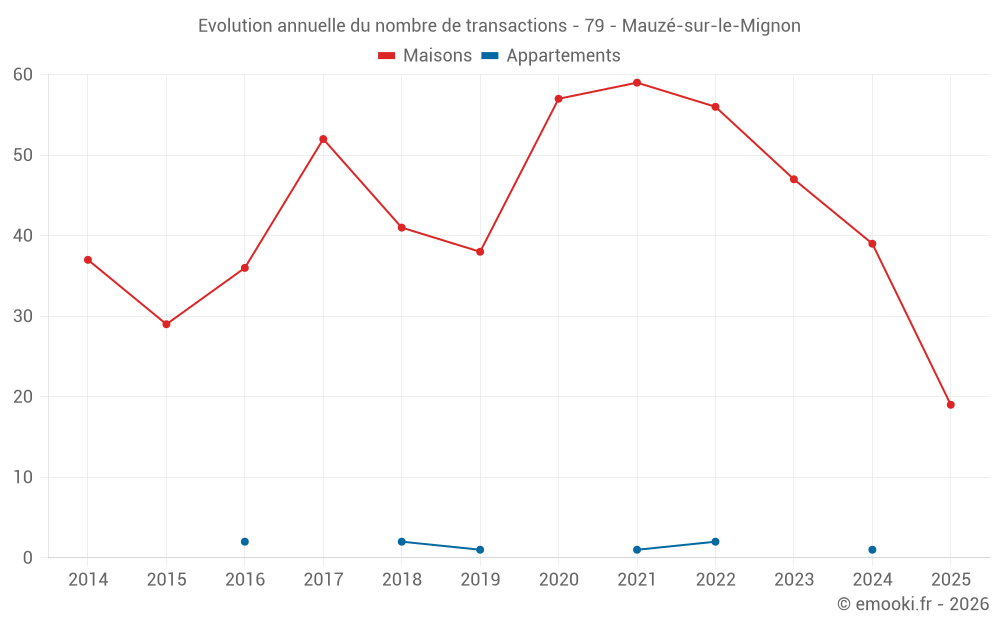 Le prix médian sur les 19 transactions de maisons des 6 derniers mois dans la commune de Mauzé-sur-le-Mignon était de 1 572 € par mètre carré pour une valeur foncière médiane de 140 000 €. Sur cette période 60% des transactions se sont situées entre 1 300 et 2 181 € par mètre carré (du 2ème au 8ème déciles).