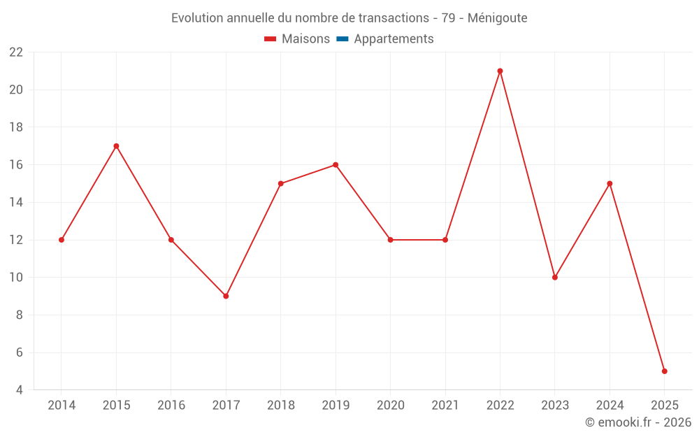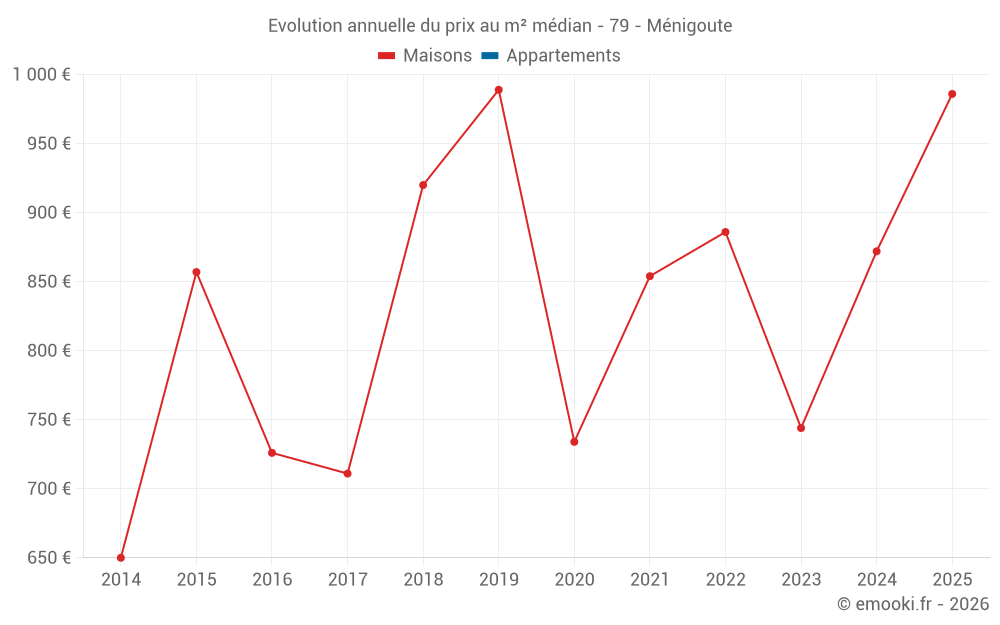 Le prix médian sur les 17 transactions de maisons des 12 derniers mois dans la commune de Ménigoute était de 921 € par mètre carré pour une valeur foncière médiane de 115 000 €. Sur cette période 60% des transactions se sont situées entre 821 et 1 142 € par mètre carré (du 2ème au 8ème déciles).