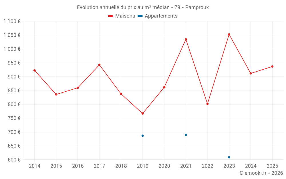 Le prix médian sur les 33 transactions de maisons des 24 derniers mois dans la commune de Pamproux était de 938 € par mètre carré pour une valeur foncière médiane de 85 000 €. Sur cette période 60% des transactions se sont situées entre 554 et 1 283 € par mètre carré (du 2ème au 8ème déciles).