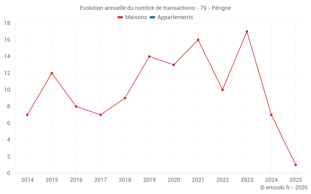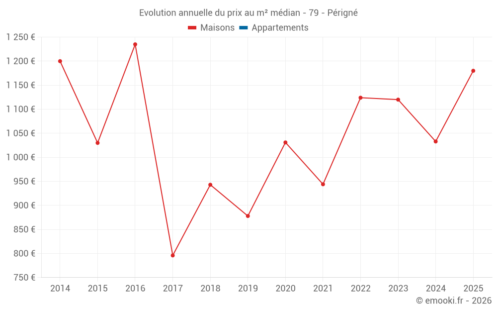 Le prix médian sur les 15 transactions de maisons des 24 derniers mois dans la commune de Périgné était de 1 055 € par mètre carré pour une valeur foncière médiane de 152 000 €. Sur cette période 60% des transactions se sont situées entre 811 et 1 231 € par mètre carré (du 2ème au 8ème déciles).