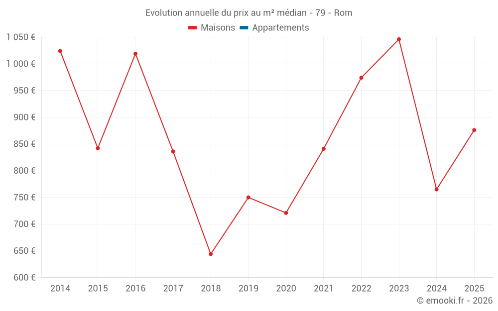 Le prix médian sur les 25 transactions de maisons des 24 derniers mois dans la commune de Rom était de 1 000 € par mètre carré pour une valeur foncière médiane de 111 205 €. Sur cette période 60% des transactions se sont situées entre 660 et 1 243 € par mètre carré (du 2ème au 8ème déciles).