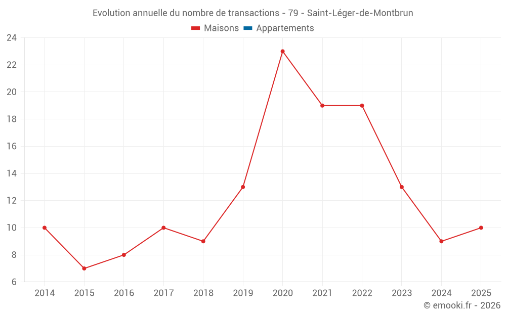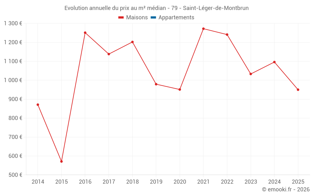 Le prix médian sur les 27 transactions de maisons des 24 derniers mois dans la commune de Saint-Léger-de-Montbrun était de 1 063 € par mètre carré pour une valeur foncière médiane de 135 000 €. Sur cette période 60% des transactions se sont situées entre 573 et 1 579 € par mètre carré (du 2ème au 8ème déciles).