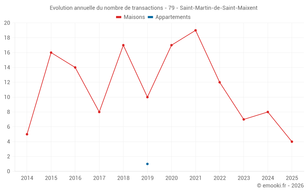 Le prix médian sur les 16 transactions de maisons des 24 derniers mois dans la commune de Saint-Martin-de-Saint-Maixent était de 1 283 € par mètre carré pour une valeur foncière médiane de 144 000 €. Sur cette période 60% des transactions se sont situées entre 807 et 1 951 € par mètre carré (du 2ème au 8ème déciles).