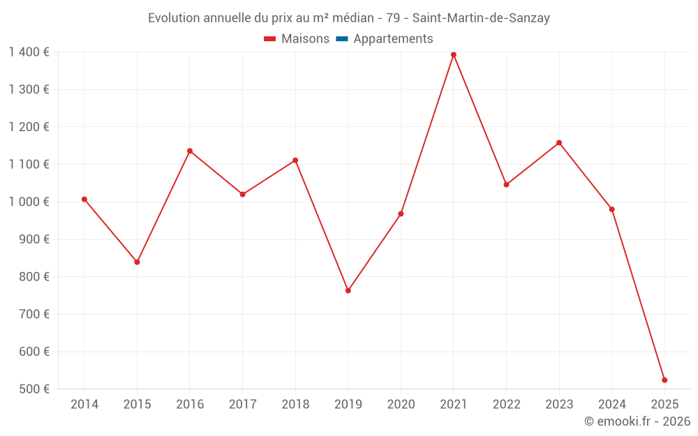 Le prix médian sur les 22 transactions de maisons des 24 derniers mois dans la commune de Saint-Martin-de-Sanzay était de 980 € par mètre carré pour une valeur foncière médiane de 87 750 €. Sur cette période 60% des transactions se sont situées entre 796 et 1 525 € par mètre carré (du 2ème au 8ème déciles).