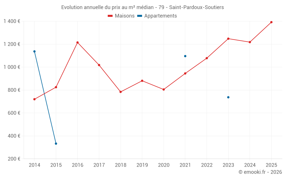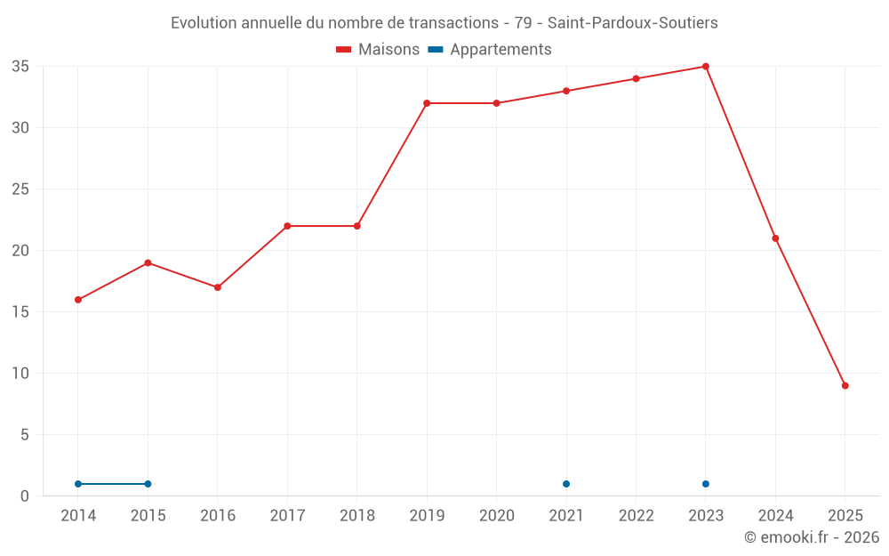 Le prix médian sur les 22 transactions de maisons des 12 derniers mois dans la commune de Saint-Pardoux-Soutiers était de 989 € par mètre carré pour une valeur foncière médiane de 103 000 €. Sur cette période 60% des transactions se sont situées entre 765 et 1 474 € par mètre carré (du 2ème au 8ème déciles).