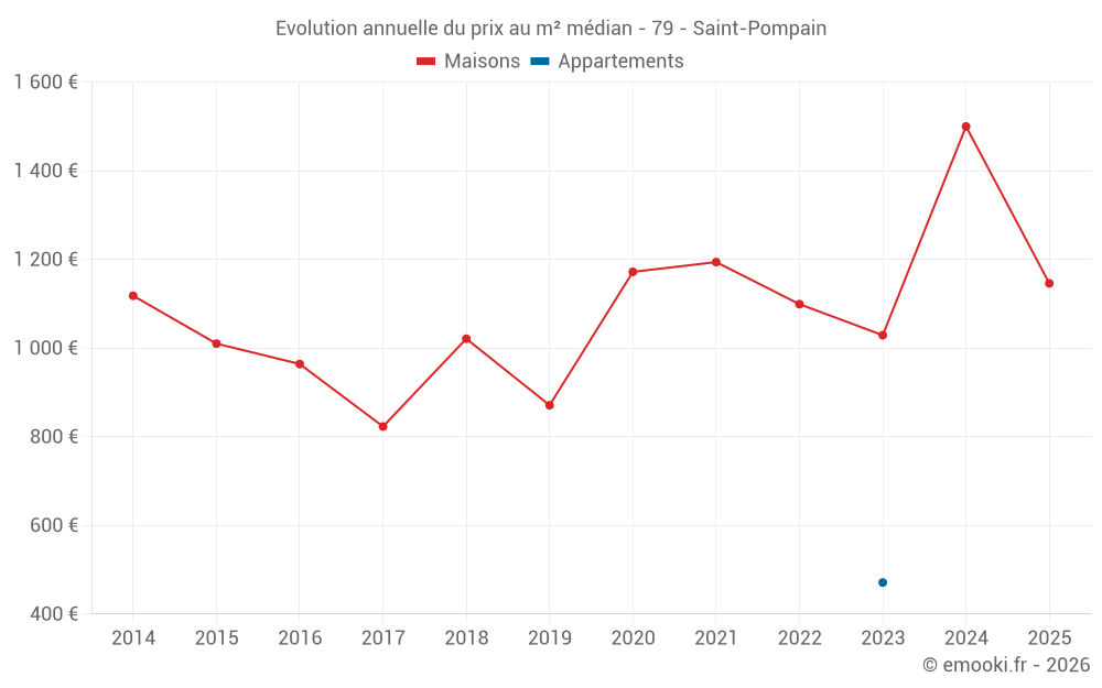 Le prix médian sur les 26 transactions de maisons des 24 derniers mois dans la commune de Saint-Pompain était de 1 201 € par mètre carré pour une valeur foncière médiane de 128 500 €. Sur cette période 60% des transactions se sont situées entre 639 et 1 862 € par mètre carré (du 2ème au 8ème déciles).