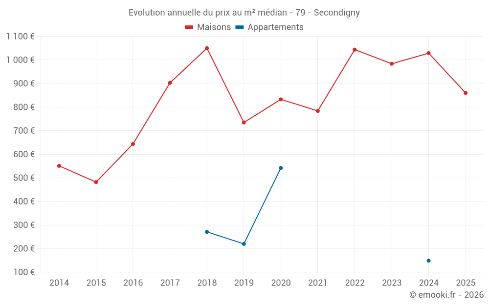 Le prix médian sur les 43 transactions de maisons des 12 derniers mois dans la commune de Secondigny était de 1 011 € par mètre carré pour une valeur foncière médiane de 105 000 €. Sur cette période 60% des transactions se sont situées entre 573 et 1 586 € par mètre carré (du 2ème au 8ème déciles).