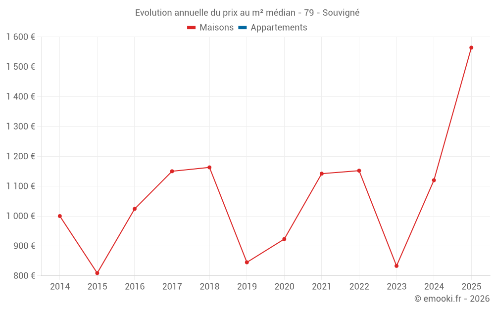 Le prix médian sur les 18 transactions de maisons des 24 derniers mois dans la commune de Souvigné était de 1 041 € par mètre carré pour une valeur foncière médiane de 109 000 €. Sur cette période 60% des transactions se sont situées entre 613 et 1 945 € par mètre carré (du 2ème au 8ème déciles).