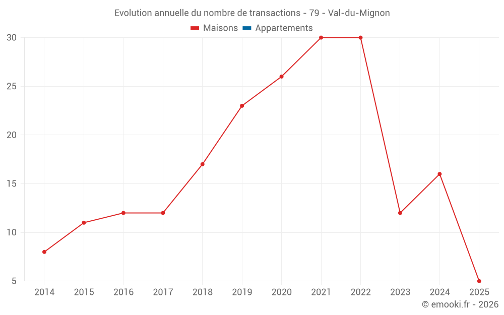 Le prix médian sur les 25 transactions de maisons des 24 derniers mois dans la commune de Val-du-Mignon était de 1 250 € par mètre carré pour une valeur foncière médiane de 145 000 €. Sur cette période 60% des transactions se sont situées entre 883 et 1 583 € par mètre carré (du 2ème au 8ème déciles).