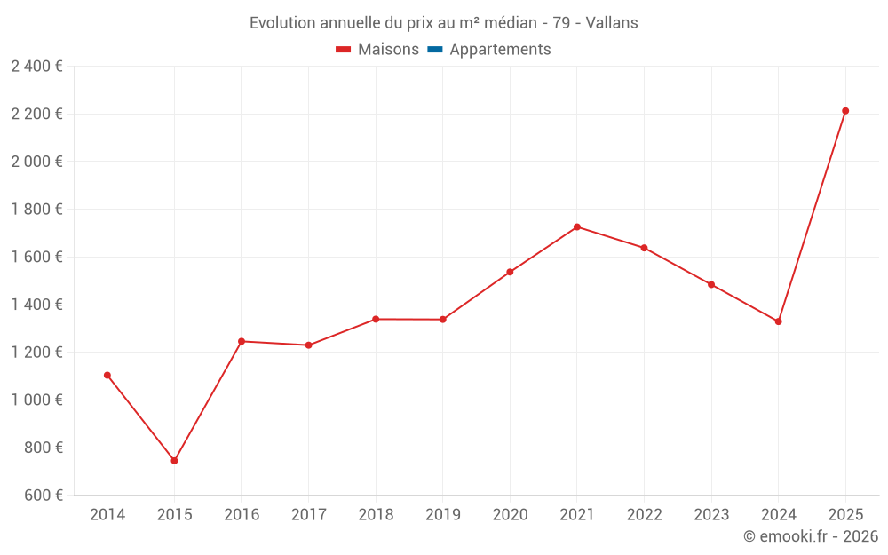 Le prix médian sur les 15 transactions de maisons des 24 derniers mois dans la commune de Vallans était de 1 686 € par mètre carré pour une valeur foncière médiane de 190 300 €. Sur cette période 60% des transactions se sont situées entre 939 et 2 167 € par mètre carré (du 2ème au 8ème déciles).