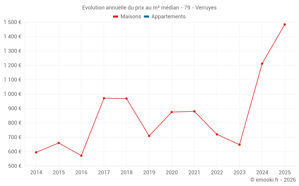 Le prix médian sur les 25 transactions de maisons des 24 derniers mois dans la commune de Verruyes était de 1 098 € par mètre carré pour une valeur foncière médiane de 95 000 €. Sur cette période 60% des transactions se sont situées entre 499 et 1 404 € par mètre carré (du 2ème au 8ème déciles).