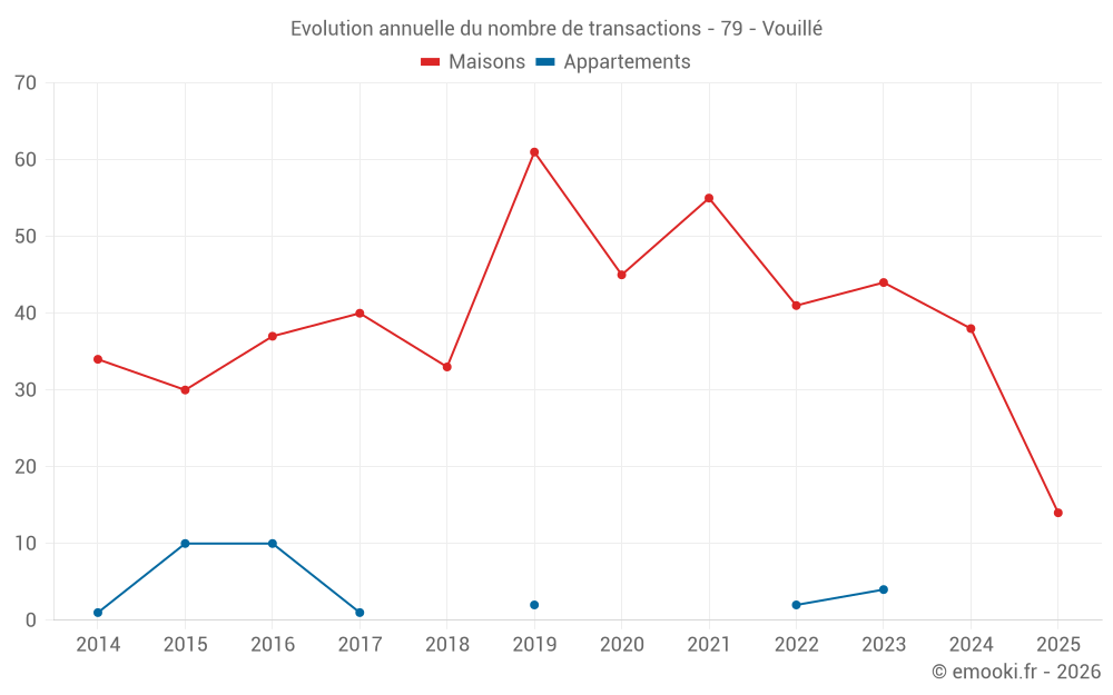 Le prix médian sur les 34 transactions de maisons des 12 derniers mois dans la commune de Vouillé était de 2 218 € par mètre carré pour une valeur foncière médiane de 226 400 €. Sur cette période 60% des transactions se sont situées entre 1 636 et 2 475 € par mètre carré (du 2ème au 8ème déciles).