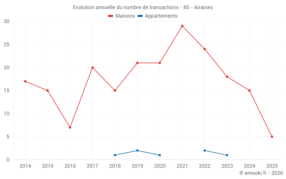 Le prix médian sur les 27 transactions de maisons des 24 derniers mois dans la commune d'Airaines était de 1 316 € par mètre carré pour une valeur foncière médiane de 110 000 €. Sur cette période 60% des transactions se sont situées entre 885 et 1 735 € par mètre carré (du 2ème au 8ème déciles).