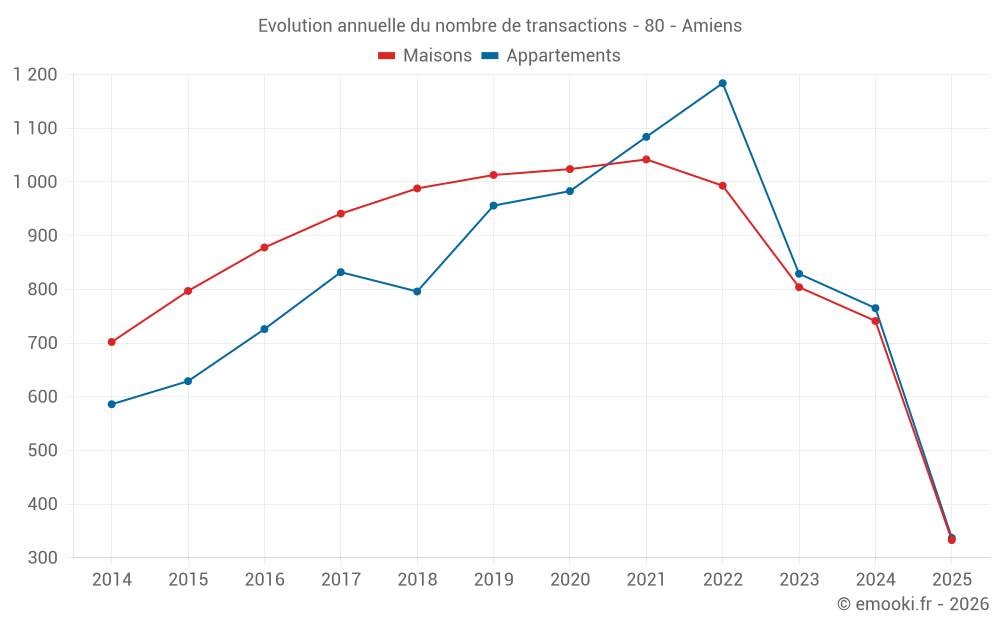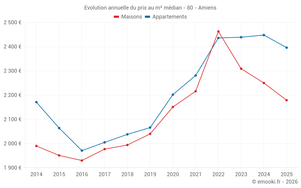 Le prix médian sur les 153 transactions de maisons des 3 derniers mois dans la commune d'Amiens était de 2 196 € par mètre carré pour une valeur foncière médiane de 177 500 €. Sur cette période 60% des transactions se sont situées entre 1 640 et 2 947 € par mètre carré (du 2ème au 8ème déciles).