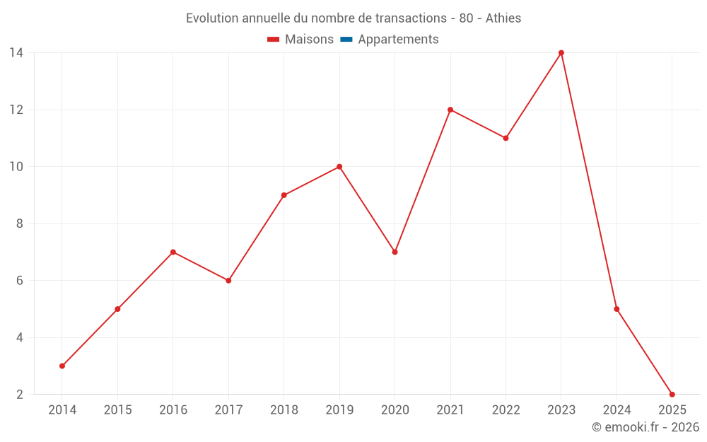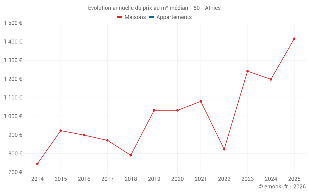 Le prix médian sur les 15 transactions de maisons des 24 derniers mois dans la commune d'Athies était de 1 331 € par mètre carré pour une valeur foncière médiane de 104 000 €. Sur cette période 60% des transactions se sont situées entre 603 et 1 518 € par mètre carré (du 2ème au 8ème déciles).