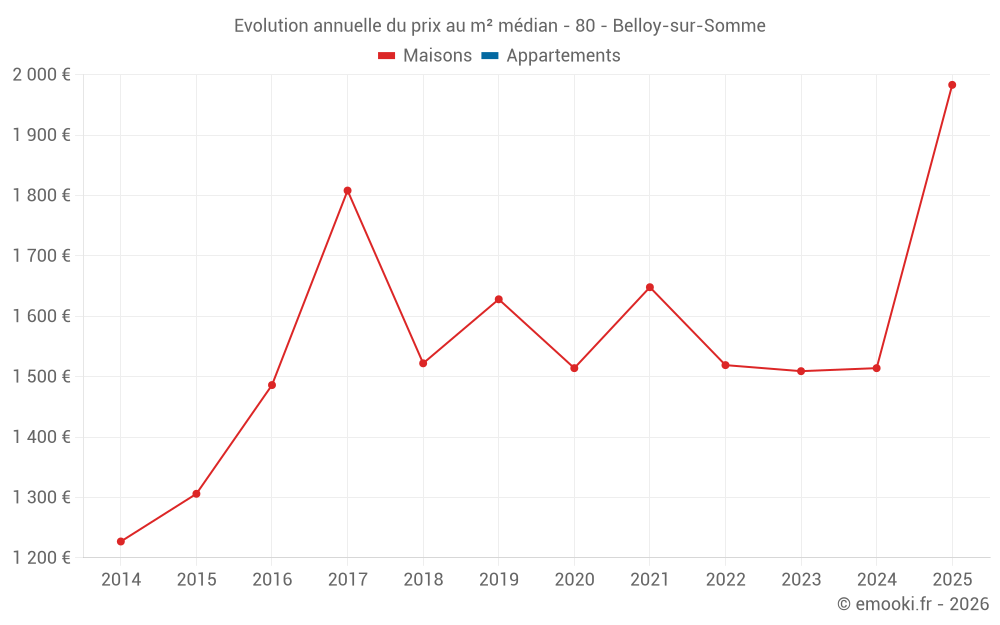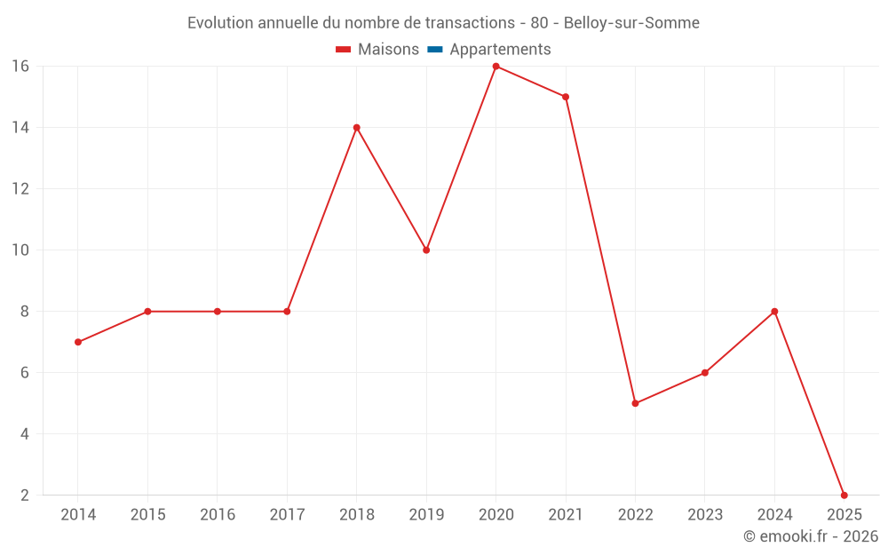Le prix médian sur les 15 transactions de maisons des 24 derniers mois dans la commune de Belloy-sur-Somme était de 1 538 € par mètre carré pour une valeur foncière médiane de 140 000 €. Sur cette période 60% des transactions se sont situées entre 1 149 et 1 884 € par mètre carré (du 2ème au 8ème déciles).