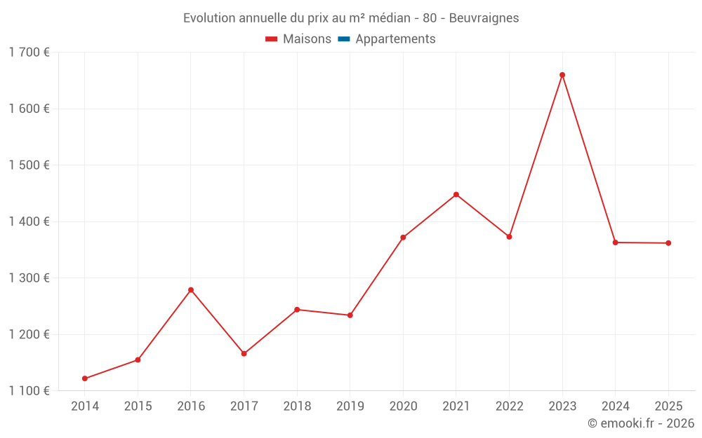 Le prix médian sur les 20 transactions de maisons des 24 derniers mois dans la commune de Beuvraignes était de 1 362 € par mètre carré pour une valeur foncière médiane de 133 550 €. Sur cette période 60% des transactions se sont situées entre 992 et 1 796 € par mètre carré (du 2ème au 8ème déciles).