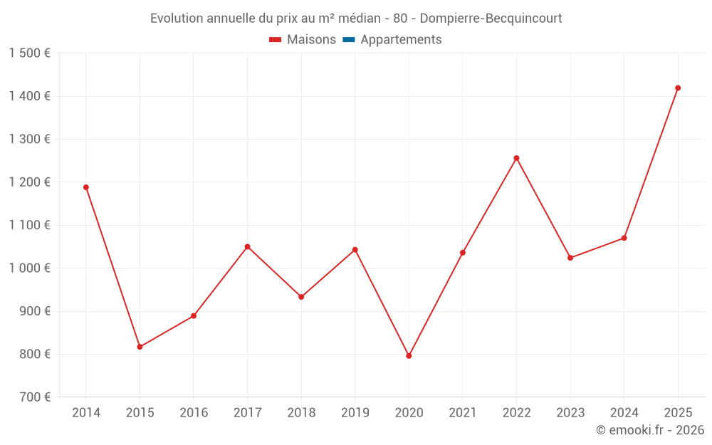 Le prix médian sur les 18 transactions de maisons des 24 derniers mois dans la commune de Dompierre-Becquincourt était de 1 032 € par mètre carré pour une valeur foncière médiane de 100 500 €. Sur cette période 60% des transactions se sont situées entre 762 et 1 377 € par mètre carré (du 2ème au 8ème déciles).