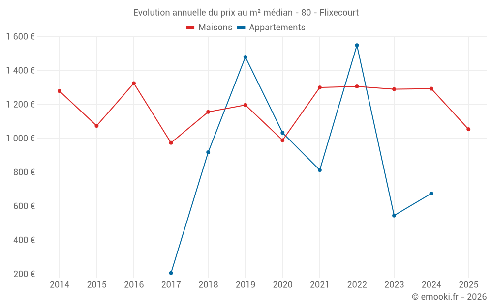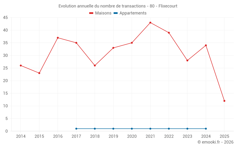 Le prix médian sur les 27 transactions de maisons des 12 derniers mois dans la commune de Flixecourt était de 1 071 € par mètre carré pour une valeur foncière médiane de 80 000 €. Sur cette période 60% des transactions se sont situées entre 738 et 1 729 € par mètre carré (du 2ème au 8ème déciles).