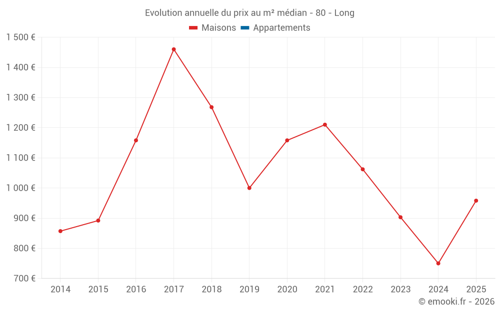 Le prix médian sur les 23 transactions de maisons des 24 derniers mois dans la commune de Long était de 877 € par mètre carré pour une valeur foncière médiane de 68 000 €. Sur cette période 60% des transactions se sont situées entre 435 et 1 416 € par mètre carré (du 2ème au 8ème déciles).