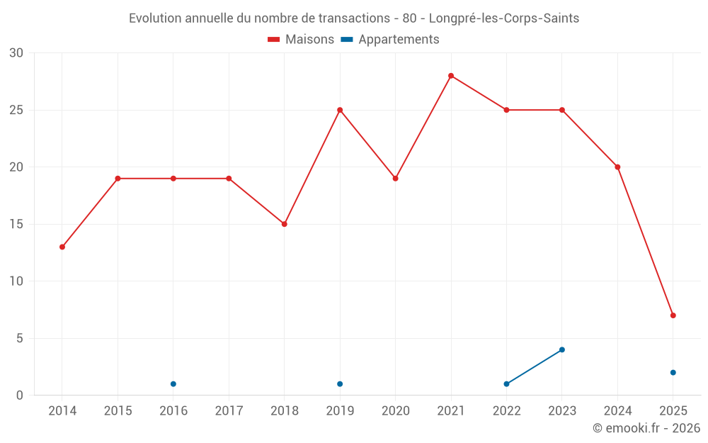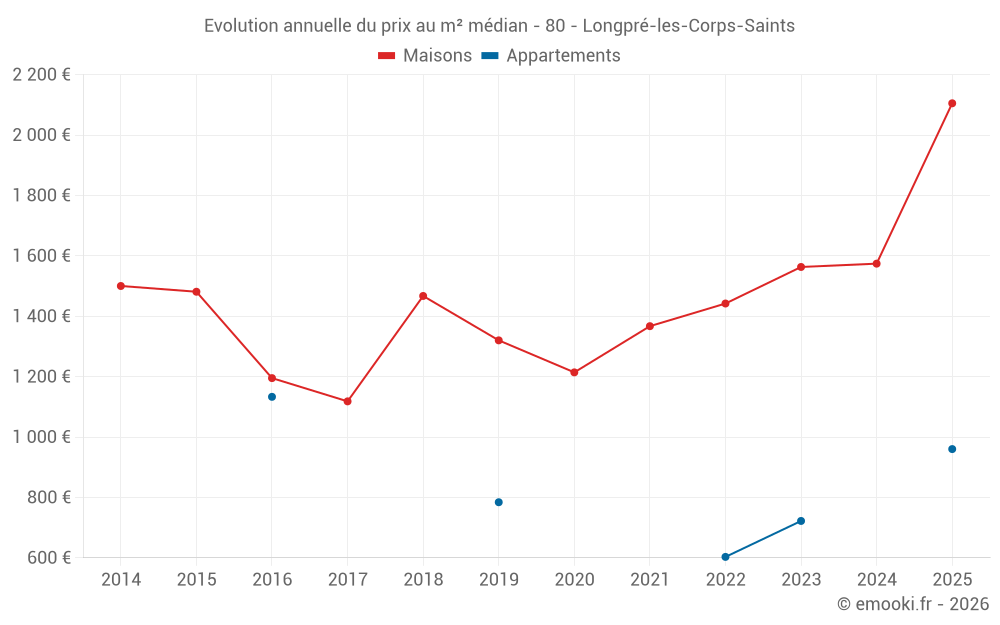 Le prix médian sur les 16 transactions de maisons des 12 derniers mois dans la commune de Longpré-les-Corps-Saints était de 1 410 € par mètre carré pour une valeur foncière médiane de 98 875 €. Sur cette période 60% des transactions se sont situées entre 746 et 2 143 € par mètre carré (du 2ème au 8ème déciles).