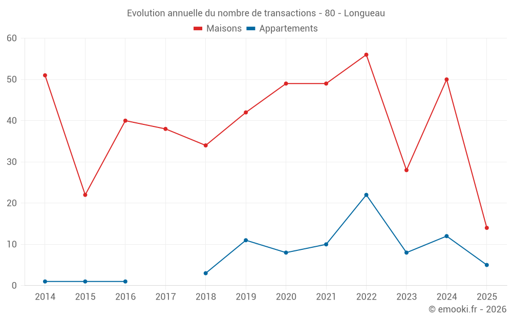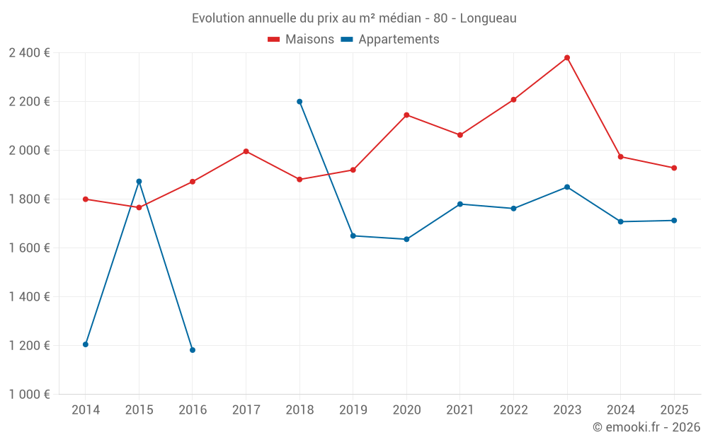 Le prix médian sur les 42 transactions de maisons des 12 derniers mois dans la commune de Longueau était de 1 966 € par mètre carré pour une valeur foncière médiane de 163 000 €. Sur cette période 60% des transactions se sont situées entre 1 793 et 2 379 € par mètre carré (du 2ème au 8ème déciles).