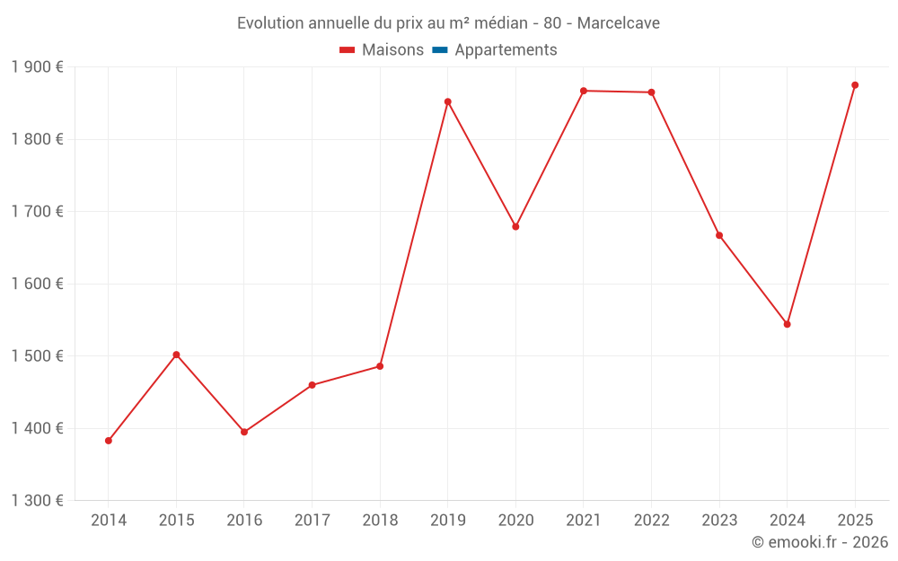 Le prix médian sur les 27 transactions de maisons des 24 derniers mois dans la commune de Marcelcave était de 1 733 € par mètre carré pour une valeur foncière médiane de 180 000 €. Sur cette période 60% des transactions se sont situées entre 1 300 et 2 075 € par mètre carré (du 2ème au 8ème déciles).