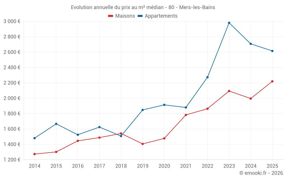 Le prix médian sur les 32 transactions de maisons des 12 derniers mois dans la commune de Mers-les-Bains était de 2 051 € par mètre carré pour une valeur foncière médiane de 154 063 €. Sur cette période 60% des transactions se sont situées entre 1 432 et 2 493 € par mètre carré (du 2ème au 8ème déciles).
