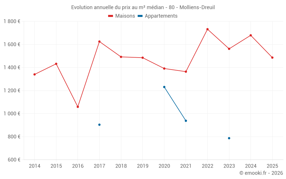 Le prix médian sur les 15 transactions de maisons des 24 derniers mois dans la commune de Molliens-Dreuil était de 1 541 € par mètre carré pour une valeur foncière médiane de 162 350 €. Sur cette période 60% des transactions se sont situées entre 1 317 et 1 708 € par mètre carré (du 2ème au 8ème déciles).