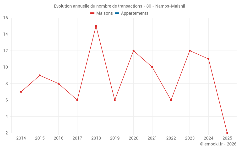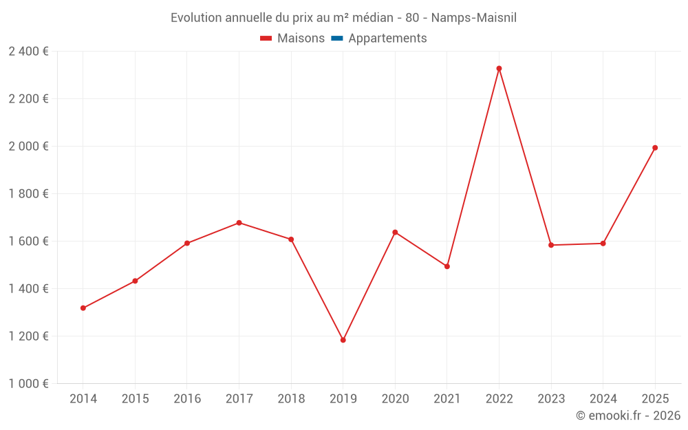 Le prix médian sur les 22 transactions de maisons des 24 derniers mois dans la commune de Namps-Maisnil était de 1 604 € par mètre carré pour une valeur foncière médiane de 182 500 €. Sur cette période 60% des transactions se sont situées entre 859 et 2 066 € par mètre carré (du 2ème au 8ème déciles).
