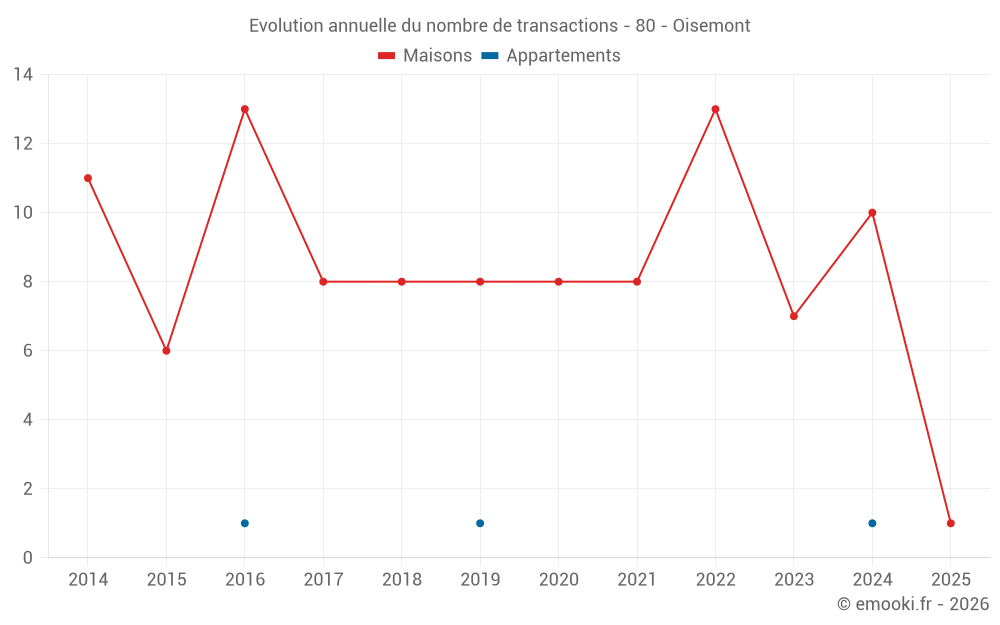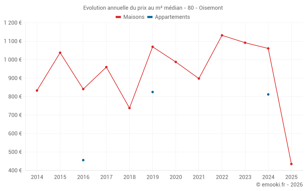Le prix médian sur les 15 transactions de maisons des 24 derniers mois dans la commune d'Oisemont était de 1 000 € par mètre carré pour une valeur foncière médiane de 94 000 €. Sur cette période 60% des transactions se sont situées entre 681 et 1 165 € par mètre carré (du 2ème au 8ème déciles).