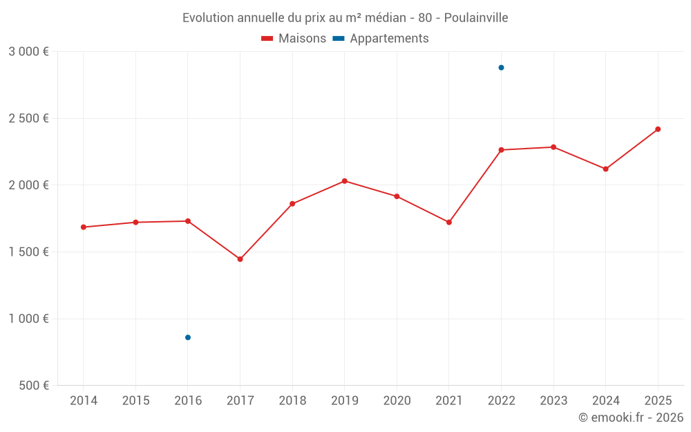 Le prix médian sur les 19 transactions de maisons des 12 derniers mois dans la commune de Poulainville était de 2 243 € par mètre carré pour une valeur foncière médiane de 221 700 €. Sur cette période 60% des transactions se sont situées entre 1 957 et 2 558 € par mètre carré (du 2ème au 8ème déciles).
