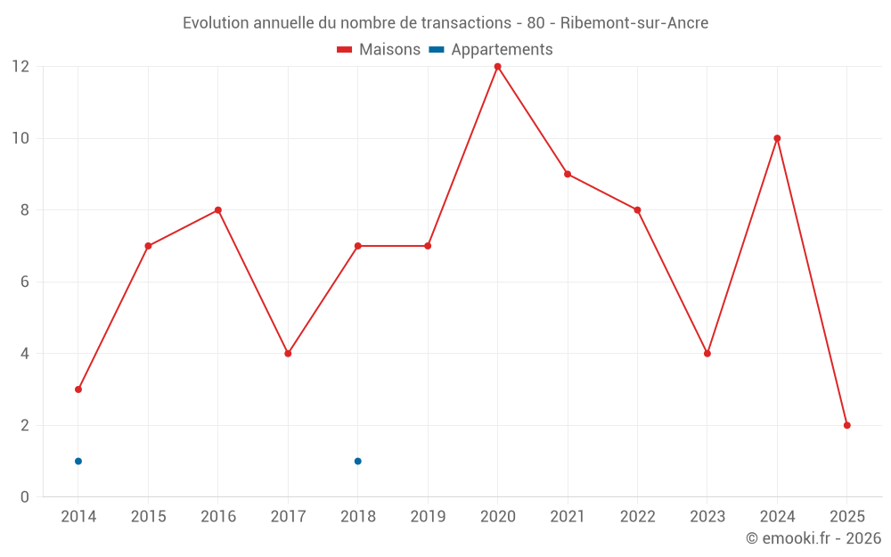 Le prix médian sur les 14 transactions de maisons des 24 derniers mois dans la commune de Ribemont-sur-Ancre était de 1 115 € par mètre carré pour une valeur foncière médiane de 124 000 €. Sur cette période 60% des transactions se sont situées entre 462 et 1 423 € par mètre carré (du 2ème au 8ème déciles).
