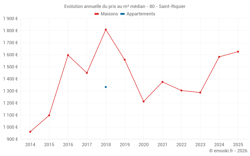 Le prix médian sur les 18 transactions de maisons des 24 derniers mois dans la commune de Saint-Riquier était de 1 606 € par mètre carré pour une valeur foncière médiane de 140 875 €. Sur cette période 60% des transactions se sont situées entre 904 et 2 071 € par mètre carré (du 2ème au 8ème déciles).