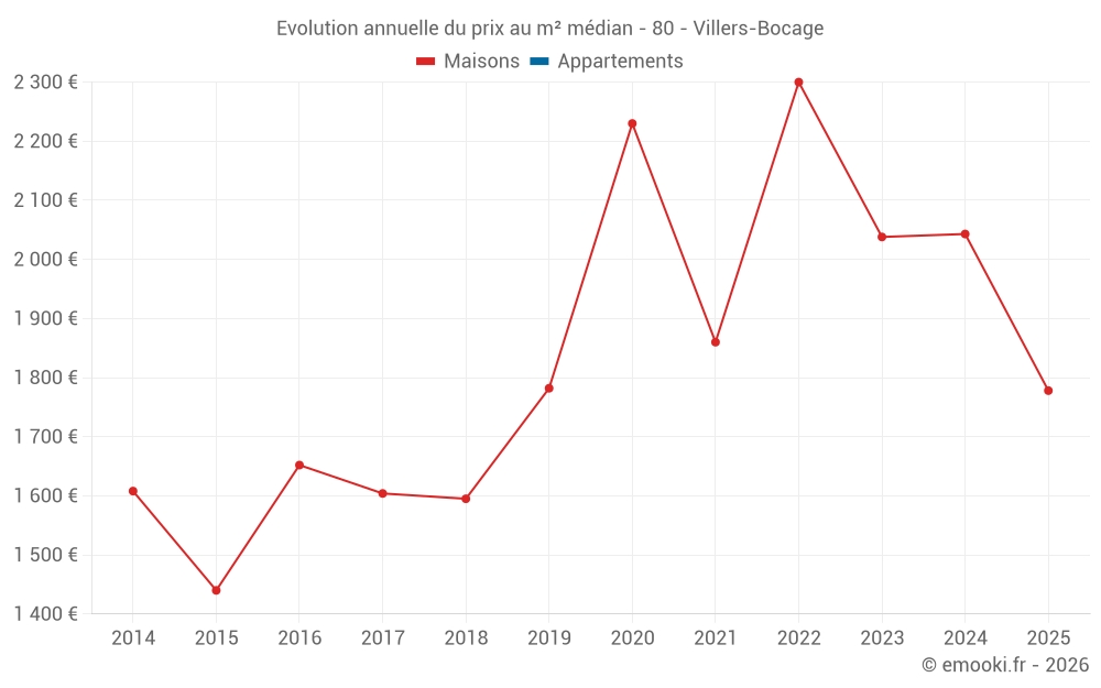 Le prix médian sur les 22 transactions de maisons des 12 derniers mois dans la commune de Villers-Bocage était de 1 836 € par mètre carré pour une valeur foncière médiane de 205 000 €. Sur cette période 60% des transactions se sont situées entre 1 516 et 2 083 € par mètre carré (du 2ème au 8ème déciles).