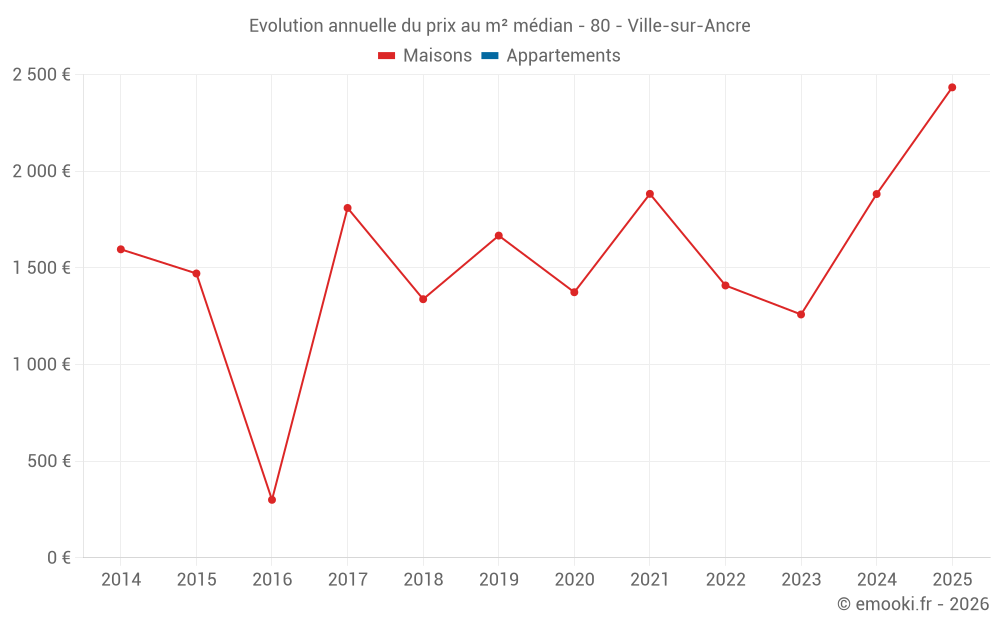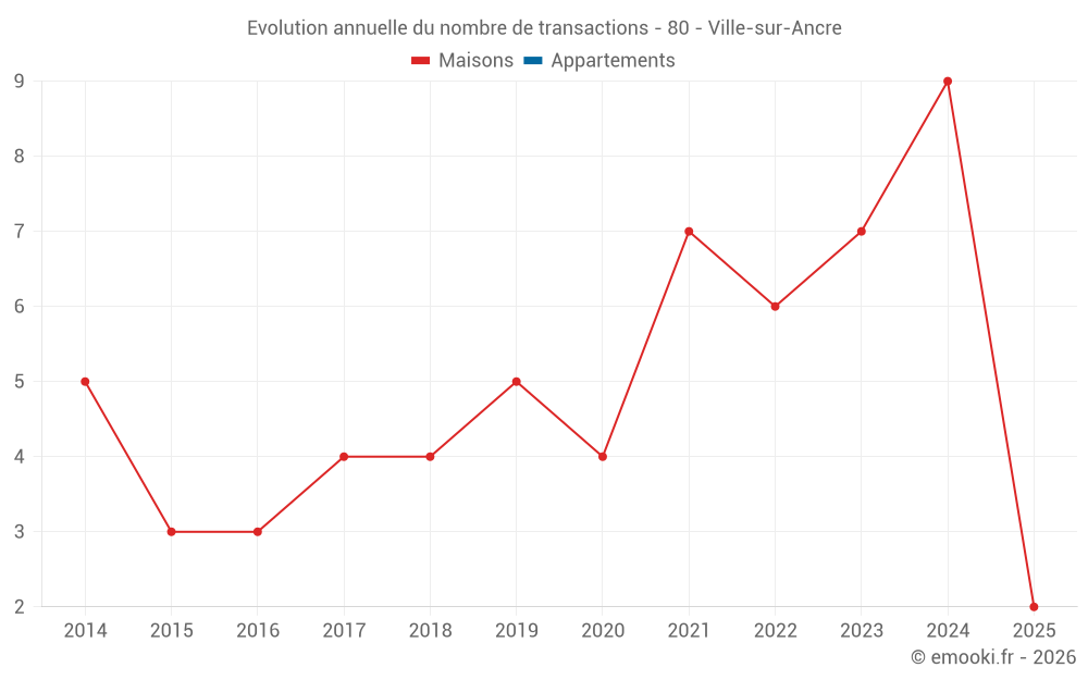Le prix médian sur les 16 transactions de maisons des 24 derniers mois dans la commune de Ville-sur-Ancre était de 1 861 € par mètre carré pour une valeur foncière médiane de 106 880 €. Sur cette période 60% des transactions se sont situées entre 1 190 et 2 826 € par mètre carré (du 2ème au 8ème déciles).