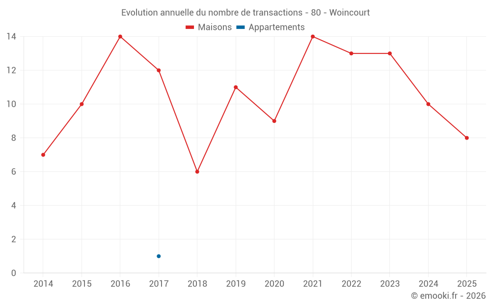 Le prix médian sur les 24 transactions de maisons des 24 derniers mois dans la commune de Woincourt était de 1 258 € par mètre carré pour une valeur foncière médiane de 105 500 €. Sur cette période 60% des transactions se sont situées entre 719 et 1 671 € par mètre carré (du 2ème au 8ème déciles).