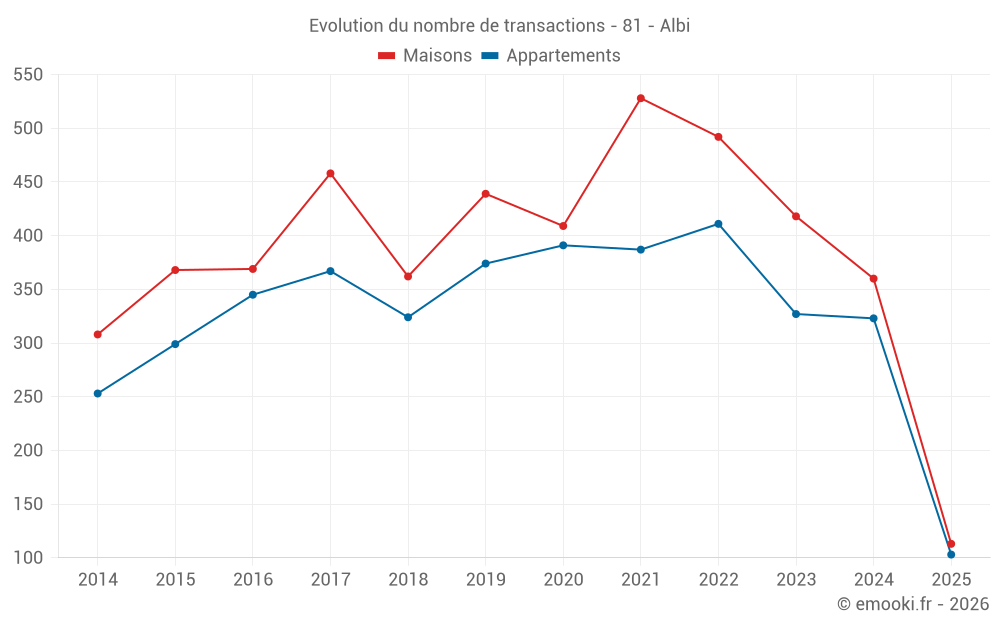 Attention, dernière année incomplète. Projections effectuées sur la base des proportions entre semestres de l'année précédente au niveau départemental/national et par catégorie de bien.
